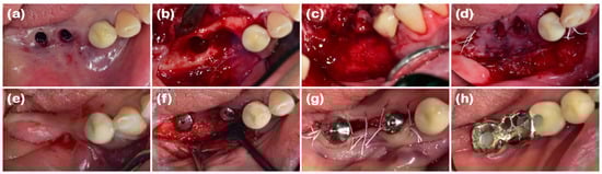 Clinical photographs of case 4. (a) Deficiency of keratinized tissue observed on the buccal side of the mandibular right implant removal areas following the removal of the implant prosthesis. (b) A severe bone defect exposed after buccally positioned incision and full-thickness flap elevation. (c) The defect was filled with DBBM. (d) Resorbable collagen membrane was placed over the bone graft, with a collagen matrix layered on the outer position. The surgical area was covered using an apically positioned flap combined with the modified Eldan–Mejchar technique. (e) The pre-operative view before implant placement. (f) The implants placed in the sufficiently augmented bone area. (g) The second implant surgery was performed. (h) Definitive prosthesis connection.