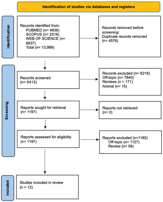 The electronic database search returned a total of 13,989 publications (PubMed N = 4836, Scopus N = 2516, and Web of Science N = 6637). After removing duplicates (N = 4576), 9413 records were available for screening. These records were assessed based on their titles and abstracts, resulting in the evaluation of 9413 studies. Of these, 8216 studies did not meet the inclusion criteria (8030 off-topic, 171 reviews, and 15 animal studies), leaving 1197 records for further review.