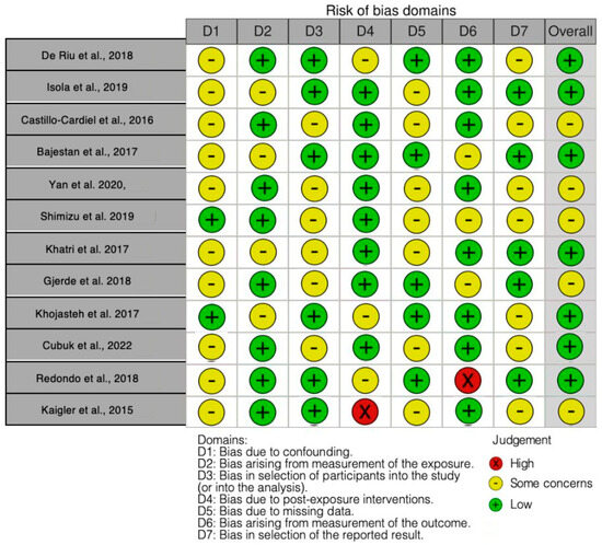 The quality of the selected studies was evaluated using the ROBINS tool. The three reviewers (M.G., I.P., and R.M.) assessed the potential bias in the following domains: