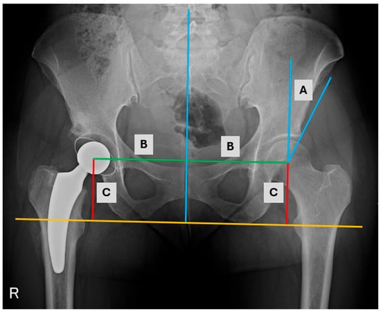 AP radiograph of the hips with measurements (A) Wiberg angle, (B) medialization, (C) distalization.