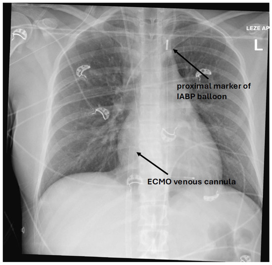 X-ray of a patient showing a proximal IABP balloon marker in aortic knob and an ECMO venous cannula with the tip in the right atrium.