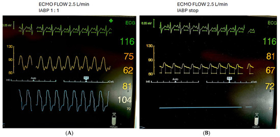 Patient with cardiogenic shock on VA ECMO and concomitant IABP with 1:1. Mode (A) and IABP stop (B).