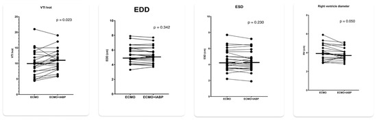 Echocardiographic parameters with 1:1 IABP augmentation and IABP stop in patients on VA ECMO for cardiogenic shock. LV VTI = left ventricular outflow velocity time integral; LVEDD = left ventricular end diastolic diameter; LVESD = left ventricular end systolic diameter: RVEDD = right ventricular end diastolic base diameter.