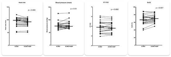 Favorable echocardiographic changes with 1:1 IABP augmentation were associated with a small but significant decrease in the heart rate and a statistically borderline increase in SvO2, while systemic arterial pressure and etCO2 remained essentially unchanged. This is consistent with improved end-organ perfusion with the 1:1 IABP augmentation, despite comparable forward aortic flow, which was roughly estimated by etCO2 in the setting of low transpulmonary blood flow and constant mechanical ventilation. A possible explanation for improved end-organ perfusion in the 1:1 IABP mode may therefore lie in diastolic pressure augmentation during balloon inflation. Improved end-organ perfusion may in part also explain the decreased mortality in patients on VA ECMO and concomitant IABP demonstrated in recent large retrospective meta-analyses [13,14]. Importantly, all favorable echocardiographic and hemodynamic changes documented in our study were rather small and did not exceed 10%. Despite statistical significance, their clinical relevance at the bedside therefore remained questionable. It appears that there are subgroups of patients that may benefit more from IABP implantation. We can speculate that IABP is more efficient in patients without vasodilatation (e.g., concomitant systemic inflammation response syndrome or septic shock) but our study was too small to further address this topic in more detail.