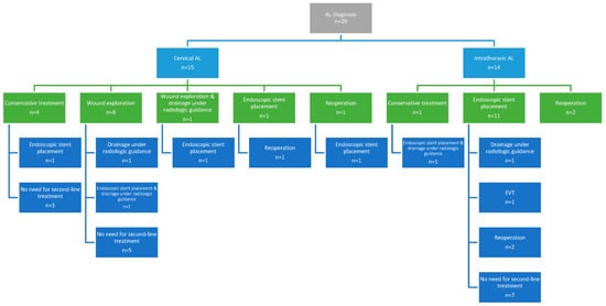 The predominant number of patients (n = 23, 79.3%) received non-operative management. The management of AL is summarized in Figure 1. In particular, conservative management with intravenous antibiotic therapy and nil per os regimen was employed as a first-line treatment in five patients (17.2%). In cervical ALs, nine patients (60%) required wound exploration and drainage. Endoscopy was performed to assess the integrity of the anastomosis and to place a SEM in 12 patients (41.4%) as a first-line and in 6 patients (20.7%) as a second-line treatment. Among them, six patients (33.3%) had a cervical anastomosis site and leakage. Of the 18 patients who underwent endoscopic stent placement, stent fixation with clips was necessary in 10 patients (55.6%). In terms of stent-related complications, six patients (33.3%) experienced stent migration, with one additionally experiencing bleeding. In addition, in two individuals (11.1%), the stent’s diameter was less than that of the gastric conduit’s lumen, resulting in ongoing leakage. Consequently, a second stent (stent-in-stent) was employed in the two latter patients, as well as three patients with stent migration. One patient (3.4%) required EVT as a second-line treatment following the clinical failure of the stent to control the leakage. The patient required four EVT changes and achieved endoscopic healing of the defect within 15 days of therapy. The median number of endoscopies per patient was 2.5 (IQR 2–3). Drainage of effusions under radiologic guidance was performed as an adjuvant therapy in six patients (20.7%). In this context, three patients (10.3%) underwent reoperation as primary and three (10.3%) as secondary management. Out of the six patients, all (100%) underwent drainage of collections, three patients (50%) underwent lung decortication and one (16.7%) feeding jejunostomy placement. Two patients (33.3%), who experienced early postoperative non-contained leakage, underwent suture reinforcement of the anastomosis along with drainage. The majority of patients were treated non-surgically, and leaks were classified as type I in 3 patients (10.3%) and type II in 20 patients (69%) according to the ECCG grading system. The remaining six patients (20.7%) required reoperation and were considered as type III leaks. No ischemia or necrosis of the conduit was documented, and there were no cases of mediastinitis. Overall, first-line treatment was successful in 58.6% of patients, with 12 patients (41.4%) requiring a second-line treatment.