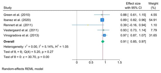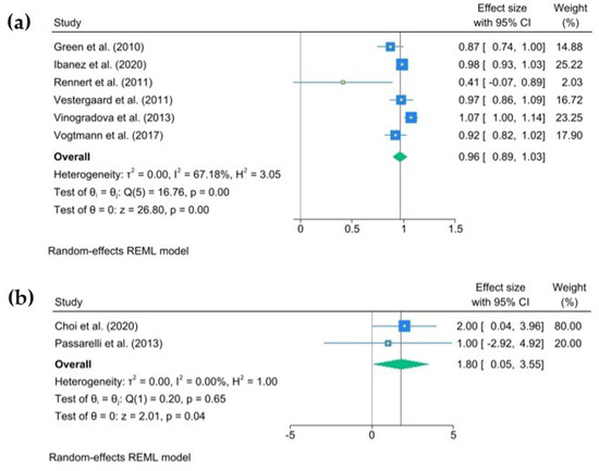 - Higgins, J.P.T.; Thompson, S.G.; Deeks, J.J.; Altman, D.D. Measuring inconsistency in meta-analyses. BMJ 2003, 327, 557–560. [Google Scholar] [CrossRef] [PubMed]