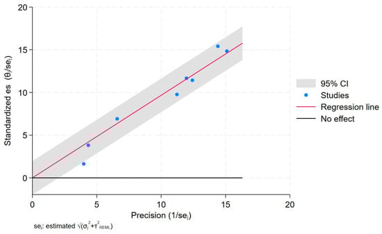 Each study is represented as a point, where the x-axis denotes the precision (defined as the inverse of the standard error), and the y-axis indicates the standardized effect size. The red regression line represents the overall summary effect estimated from the random-effects model, and the gray shaded area corresponds to the confidence interval at 95% around regression line. The horizontal black line at y = 0 corresponds to the line of no effect, serving as a reference.