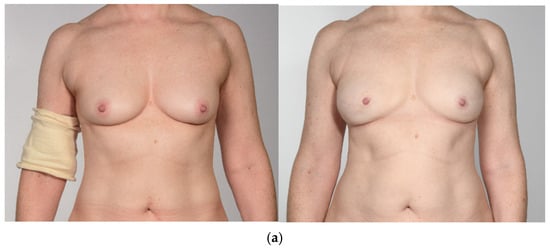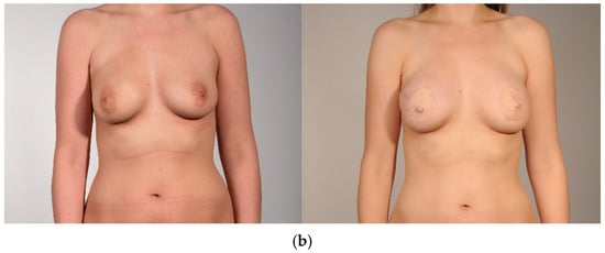 Forty-five patients received a PAP flap with a vertical or horizontal skin island design between January 2016 and April 2023 after uni- or bilateral mastectomy. Inclusion criteria were age > 18 years, follow-up time of at least 12 months, diagnosis of breast cancer, high-risk genetic disposition, or recurrent infections of the breast. Exclusion criteria were metastatic disease, Poland’s syndrome, and psychiatric disorders. A total of 30 of the 45 patients received a horizontal skin island design and 15 patients a vertical skin island. We excluded two patients from the vertical group due to metastatic disease and three patients because of the missing preoperative BREAST-Q documentation. In the horizontal skin island group, four patients were excluded because of metastatic disease, two because of psychiatric disorder, three patients because of loss of follow-up, and two patients declined participation. Nine patients with missing preoperative BREAST-Q questionnaires in the horizontal group were also excluded. In all, 20 patients (10 with a vertical skin island design and 10 with a horizontal skin island design) were invited to our Department for clinical examinations, photo documentation, and to complete the postoperative questionnaires. In the vertical skin island group, two patients received adjuvant chemotherapy, and one patient had previous chemotherapy. Four patients underwent adjuvant radiotherapy. In the horizontal skin island group, two patients received adjuvant chemotherapy, and five had previous chemotherapy. Three patients received adjuvant radiotherapy, and three patients had previous radiotherapy. Representative pre- and postoperative images of PAP flap breast reconstruction are shown in Figure 1: (a) vertical design, (b) horizontal design.