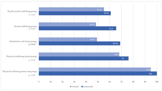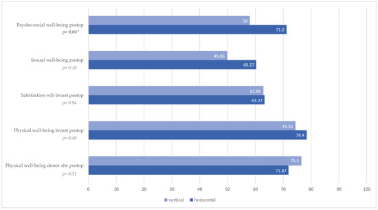 Evaluation of preoperative BREAST-Q revealed a significantly higher satisfaction with the breast in the horizontal patient group (p = 0.02, Figure 2, Table 3). There was no statistically significant difference preoperatively in the other categories, psychosocial well-being (p = 0.42, Figure 2, Table 3), sexual well-being (p = 0.08, Figure 2, Table 3), and physical well-being breast (p = 0.34, Figure 2, Table 3) and physical well-being donor site (p = 0.08, Figure 2, Table 3).