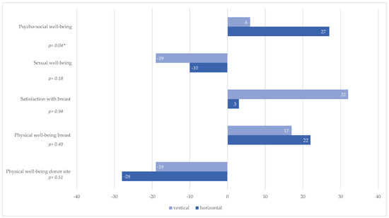Comparative analysis of the pre- and postoperative results revealed statistically significant differences in the vertical skin island group in the category of satisfaction with breast (p = 0.02, Table 4) and in the category of physical well-being of the donor site (p = 0.01, Table 4). However, there was no significant difference comparing pre- and postoperative results of the vertical skin island group in the categories of psychosocial well-being (p = 0.67), sexual well-being (p = 0.08), and physical well-being of the breast (p = 0.37). In the horizontal skin island group, there was a significant difference pre- and postoperatively in the category of physical well-being donor site (p < 0.01, Table 4). No significant difference comparing pre- and postoperative results of the horizontal skin island group was observed in the categories of psychosocial well-being (p = 0.14, Table 4), sexual well-being (p = 0.45, Table 4), satisfaction with breast (p = 0.47, Table 4), and physical well-being of the breast (p = 0.75, Table 4).