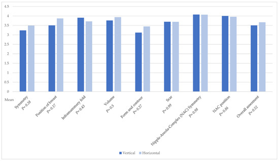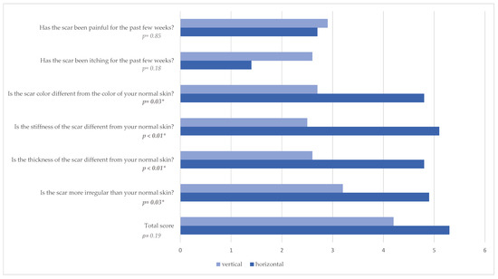 The observers assessed the vertical scar as less pigmented (p = 0.03, Table 7), thinner (p = 0.02), and with less relief (p = 0.02). The total score was given as 2.7 in the vertical group and as 3.2 in the horizontal group (p = 0.46).