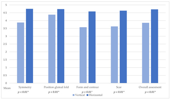 Analysis of aesthetic outcome of the thigh revealed a significantly better cosmetic result in horizontal skin island group throughout all categories, symmetry of the thigh (p < 0.01, Figure 6), position of the gluteal fold (p < 0.01, Figure 6), form and contour of the thigh (p < 0.01, Figure 6), appearance of the scar (p < 0.01, Figure 6), and overall appearance (p < 0.01, Figure 6).