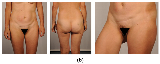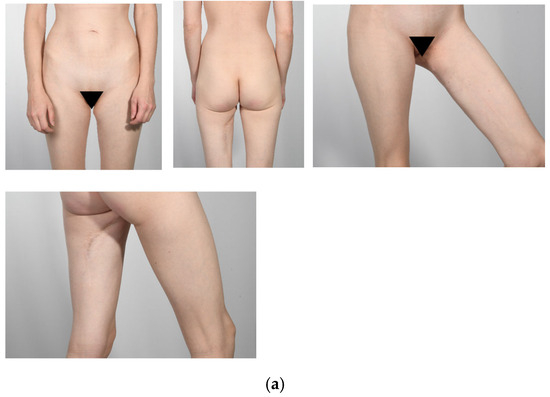 Assessing cosmetic results of the breast, we used the Breast Aesthetic Scale [25]. Four gender-balanced plastic surgeons, consisting of two residents and two board-certified senior surgeons, analyzed the donor site and the aesthetic outcome of the breast. The questionnaire was completed based on standardized postoperative photo documentation. A comparative evaluation of both patient groups revealed no significant differences in the aesthetic outcome of the breast (Figure 7). Pre- and postoperative images of the donor site are presented in Figure 8.