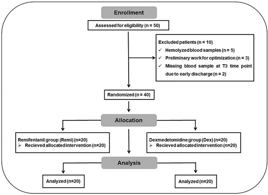 Patients with mental disorders, cardiac arrhythmia, Mobitz type-2 heart block, coronary artery disease, ischemic heart disease, liver or kidney diseases, known hypersensitivity or allergic reactions to the study drugs, or those who had undergone revision surgery for recurrent LDH were excluded from the study. Based on a clinical effect size of 0.2 (Cohen’s d) between the relative mean mRNA values of the remifentanil and dexmedetomidine groups, a sample size calculation was performed with a maximum type I error rate of 5% and a minimum statistical power of 90%. As a result, 20 patients were included in each group, for a total of 40 patients who underwent single-level unilateral lumbar microdiscectomy. The total number of patients was determined using power analysis (G-power version 3.1.9.6). Before the study, a randomization table was created using the random matching method E-PICOS AI Smart Biostatistics Software (version 21.3, New York, NY, USA), and patient selection was performed using the double-blind method. The CONSORT flow diagram of the study is presented in Figure 1. The initial target sample size was 50 patients; however, following the exclusion of 10 patients, the final randomized sample size for each group was 20.