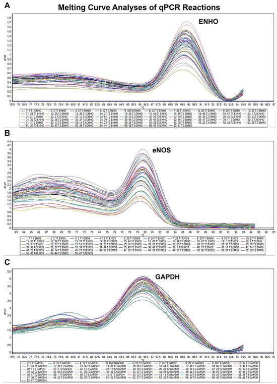Total RNA was isolated using a commercial kit (Hibrigen, MG-RNA-01, Kocaeli, Türkiye) from whole blood samples. After measuring RNA concentrations using a spectrophotometer (Thermo Scientific Multiscan Go, Vantaa, Finland), RNA samples were pre-diluted for further cDNA synthesis (abm, OneScript Plus, Vancouver, BC, Canada) with the following reaction conditions in a thermal cycler (BioRad, Hercules, CA, USA): 15 min at 50 °C, 5 min at 85 °C, and storaed at 4 °C. cDNAs were pre-diluted (1/5) for further qPCR reactions (HOT FIREPol® EvaGreen® qPCR Mix Plus, Solis Biodyne, Tartu, Estonia) using RotorGene Q (Qiagen, San Diego, CA, USA) under the following conditions: initial denaturation for 12 min at 95 °C; 40 cycles of 15 s at 95 °C, 40 s at 65 °C, and 40 s at 72 °C; final melting curve analysis between 61 °C and 95 °C. The specific primers used in the qPCR reactions for adropin (ENHO), eNOS, and GAPDH are listed in Table 1, and the melting curve analyses are depicted in Figure 2. The raw cycle threshold (Ct) values were normalized to the internal housekeeping control GAPDH, and the relative mRNA levels of the target genes were calculated using the 2−ΔCt method [26].