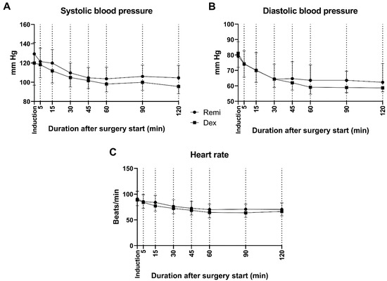 Intraoperative systolic (A) and diastolic (B) blood pressures and heart rates (C) of patients in the remifentanil and dexmedetomidine groups. Remi: Remifentanil, Dex: Dexmedetomidine.