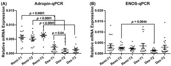 Patients who received remifentanil exhibited significantly higher adropin mRNA levels at T1, T2, and T3 than those who received dexmedetomidine (Figure 4A, p < 0.05). Additionally, in the dexmedetomidine group, adropin mRNA levels at T1 were significantly higher than those at T2 (Figure 4A, p < 0.05). The eNOS mRNA level at T2 was also significantly higher in the remifentanil group than in the dexmedetomidine group (Figure 4B; p < 0.05).