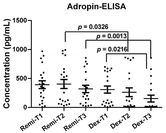 Additionally, in the dexmedetomidine group, adropin protein levels at T3 were significantly lower than those at T1 (Figure 5, p < 0.05).