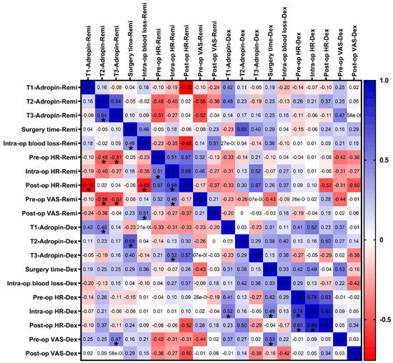Correlation analyses were conducted to evaluate the potential associations between serum adropin levels and selected clinical and surgical parameters in both the remifentanil and dexmedetomidine groups (Figure 6). We found no significant correlation between the clinical parameters (e.g., pre-op and post-op VAS, intra-op blood loss, etc.) and adropin levels at the corresponding time point (i.e., T1 vs. pre-op, T2 vs. intra-op, or T3 vs. post-op).