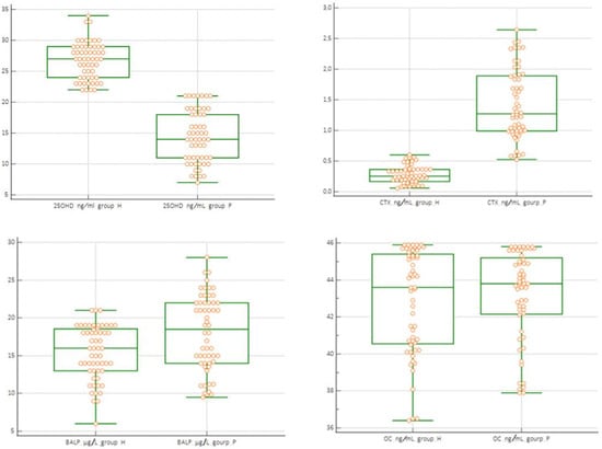 In H subjects, Tukey’s test was used to identify and exclude any anomalous data in the concentration of biomarkers. The presence of even a single value of a bone metabolism biomarker “suspected outliers” or 25OHD 25(OH)D deficiency status based on circulating levels < 20 ng/mL (<50 nmol/L) was used as a criterion to exclude normal subjects from the statistical calculation.