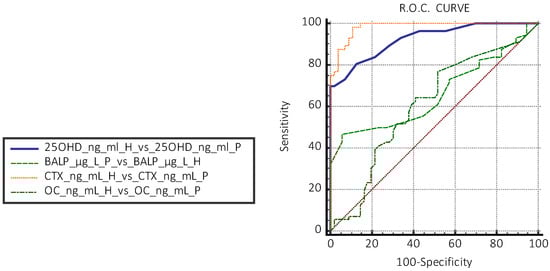 Evaluation of ROC curves between apparently healthy subjects (H) vs. patients with cysts (P) of 25OHD 25(OH)D, CTX, BALP, and OC (H = healthy group, P = pathological group).