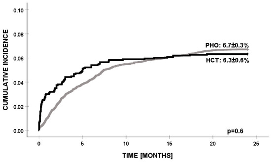 By accounting for competing events, we found that the cumulative incidence of PSA infection was significantly higher in HCT patients below 10 years of age (p = 0.003). In the PHO group, PSA infections were identified significantly earlier, while in the HCT group, the time from the day of transplant to PSA infection was over 5 months (p = 0.000). There were no other significant demographic or clinical factors affecting the cumulative incidence of PSA infection in any of the patients’ settings (Table 2). There were no differences in the cumulative incidence of infection with PSA between the PHO and HCT patients (6.71% vs. 6.32, p = 0.624) (Figure 1).