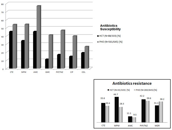 Antibiotics’ susceptibility/resistance. PHO—pediatric hematology and oncology, HCT—hematopoietic cell transplantation, CTZ—ceftazidime, MPM—meropenem, AMC—amikacin, GMC—gentamycin, PIP/TAZ—piperacilline/tazobactam, CIP—ciprofloxacin, COL—colistin, and MDR—multidrug resistance.
