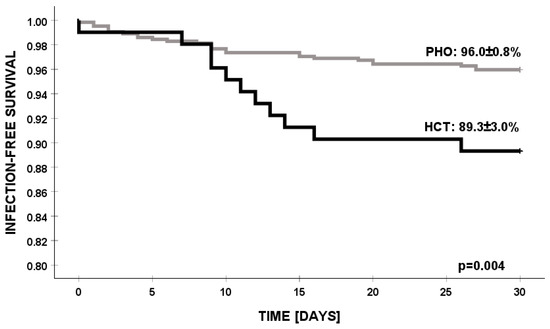 The 30-day survival rate for PSA infection in the PHO setting was significantly higher compared to in the HCT group (96% vs. 89.3%, p = 0.004) (Figure 3).