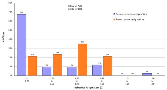 Figure 1 displays postoperative spherical equivalent accuracy. In the EDOF group, 92% of eyes were within ±0.50 D, and 97% were within ±1.00 D of the intended target. The mean postoperative spherical equivalent was 0.15 ± 0.35 D, not significantly different from the control group (0.09 ± 0.28 D, p = 0.214). Postoperative residual astigmatism was ≤0.50 D in 77% of eyes, with a mean refractive cylinder of −0.28 ± 0.41 D, again not significantly different from the control group (p = 0.128). For the astigmatism, Figure 2 shows the cumulative histogram representing the postoperative refractive astigmatism against the preoperative corneal astigmatism. A total of 98% of eyes exhibited a postoperative refractive cylinder of ≤1.00 D, and 77% of eyes were within ≤0.50 D. The mean postoperative cylinder was –0.28 ± 0.41 D, with values ranging from 0 to –1.50 D. This residual cylinder value is not significantly different from that obtained in the control group, of −0.36 ± 0.39 D (p = 0.128). Figure 3 illustrates that most eyes attained a postoperative spherical equivalent within ±0.50 D and refractive astigmatism ≤0.50 D, demonstrating the procedure’s refractive precision and its efficacy in minimizing residual astigmatism.