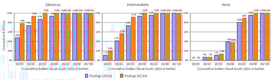 Cumulative postoperative monocular uncorrected distance visual acuity (UDVA) and corrected distance visual acuity (CDVA) at far, intermediate, and near distances in the Asqelio™ extended-depth-of-focus intraocular lens group.