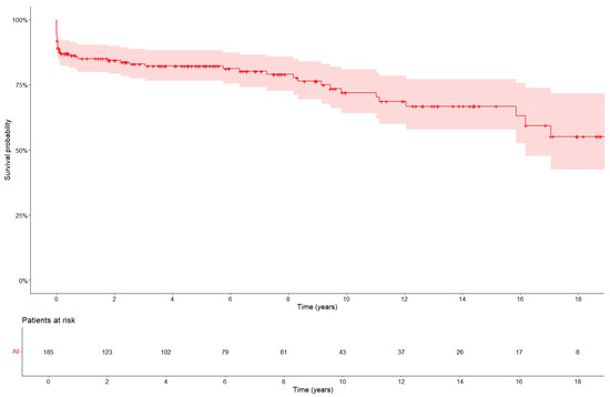 The main aim of the current study was to assess all-cause mortality. After reoperation, 51 out of 192 patients died, resulting in an all-cause mortality of 26.6%. In total, 4.2% (8/192) of the patients died during the operation itself, 8.3% (16/192) of the patients died postoperatively but in-hospital, and 14.1% (27/192) of patients died after discharge. The 30-day mortality was 13% (25/192). Overall survival was 84%, 81%, and 71% at 1, 5, and 10 years, respectively (Figure 1). The main causes of death included cardiovascular causes (49%, 25/51), bleeding (15.7%, 8/51), and non-cardiac causes such as sepsis (7.8%, 4/51). The cause of death was unknown in 14 patients.