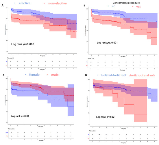 Kaplan–Meier curves demonstrating the overall survival over 18 years stratified for: (A) Electiveness of reoperation (mean survival for elective reoperation 17.5 (95% CI: 15.5–19.6) vs. 12.2 (95% CI: 10.1–14.2) years for non-elective reoperations; Log rank p < 0.01). (B) Patients not receiving concomitant procedure in addition to aortic root reoperation vs. patients receiving concomitant procedure at reoperation (mean survival 18.4 (95% CI: 16.4–20.3) vs. 11.6 (95% CI: 9.7–13.5) years, respectively; Log rank p < 0.01). (C) Gender (mean survival for male gender 16.7 (95% CI: 14.9–18.5) vs. 12.4 (95% CI: 9.3–15.5) years for female gender; Log rank p = 0.04). (D) Patients not receiving the combined procedure at the aortic arch at reoperation vs. patients receiving the combined procedure at the aortic arch at reoperation (mean survival 16.8 (95% CI: 15.1–18.5) vs. 8.9 (95% CI: 6–11.8) years, respectively; Log rank p = 0.02). Overall survival was defined as the time in years from reoperation on the aortic root until the end of follow-up (September 2023) or the incidence of death.