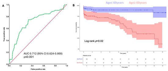 (A) ROC curve for age in years for the prediction of mortality during follow-up. The area under the curve (AUC) indicates prognostic value for age for predicting death in patients undergoing reoperation on the aortic root (AUC = 0.712; 95% CI: 0.624–0.800, p < 0.01). The cut-off value for age in years chosen with the best Youden index for the prediction of mortality was 60 years (sensitivity 74.5%, specificity 66.7%). (B) Stratified Kaplan–Meier survival analysis for the overall survival of patients who are ≤ 60 years old is significantly better as compared to those who are older than 60 years at the time of reoperation (mean survival 19.9 (95% CI: 18.4–21.4) vs. 9.5 (95% CI: 7.7–11.3) years, respectively; Log rank test p = 0.02). Overall survival was defined as the time in years from reoperation on the aortic root until the end of follow-up (September 2023) or the incidence of death.