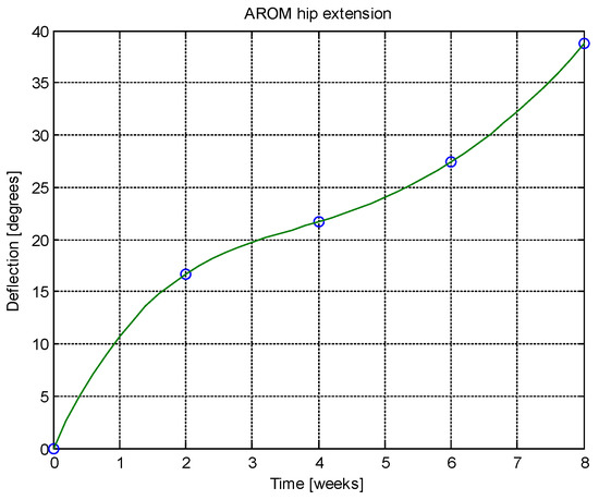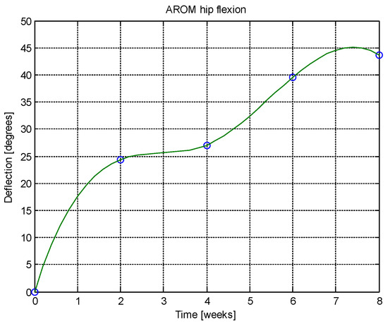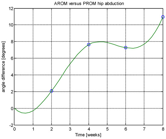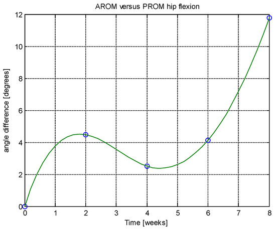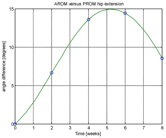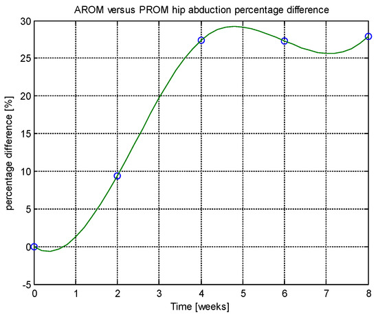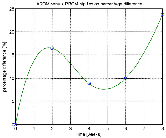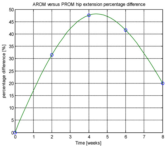 From this table, AROM, PROM, angle difference, and percentage difference variation depending on time (weeks) were plotted via the Matlab software package, and the following figures were obtained.