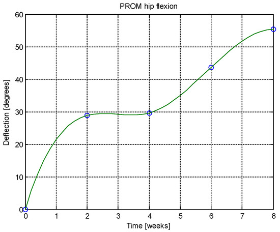 - In PROM flexion after 8 weeks, deflection increases of 1.92° over the first week are observed.