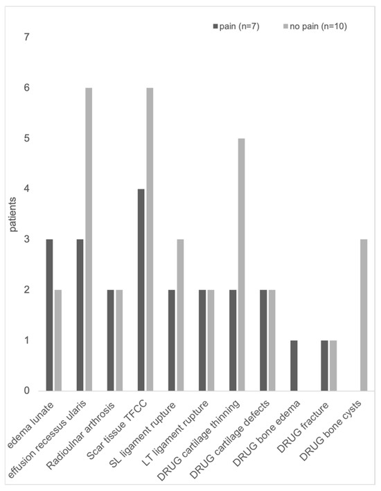 Bone edema could be found in the lunate of five patients (29%) (three with, two without pain) and in the DRUJ of one patient (6%) with pain (Table 3, Figure 2 and Figure 5).