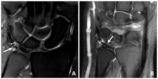 (A,B) Coronal IM-weighted SPIR sequences of a 53-year-old patient with severe degenerative changes of the TFCC. Note the signal inhomogeneities (arrows) of the TFCC, which are due to scarring and fluid deposition.