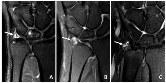 (A–C) Coronal IM-weighted SPIR sequences of 49 to 61-year-old patients with fluid (arrows) in the ulnar recess after arthroscopy.