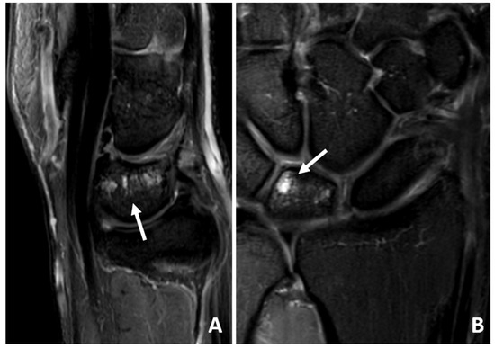 (A) Sagittal IM-weighted SPIR sequence and (B) coronal IM-weighted SPIR sequence of a 56-year-old patient with bone marrow edema of the lunar bone (arrows).
