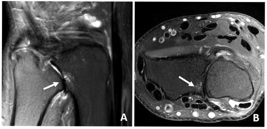(A) Coronal IM-weighted SPIR sequence and (B) transversal IM-weighted SPIR sequence of a 62-year-old patient with severe radioulnar arthrosis. Note the typically degenerative findings like joint space narrowing and thinning of the cartilage (arrow in (A)) as well as subchondral cyst formation (arrow in (B)).