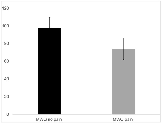 MWQ of the patients with pain (73% average ± 13.9) and MWQ of the pain-free patients (98% average ± 2.1).