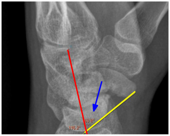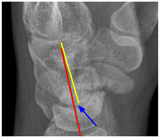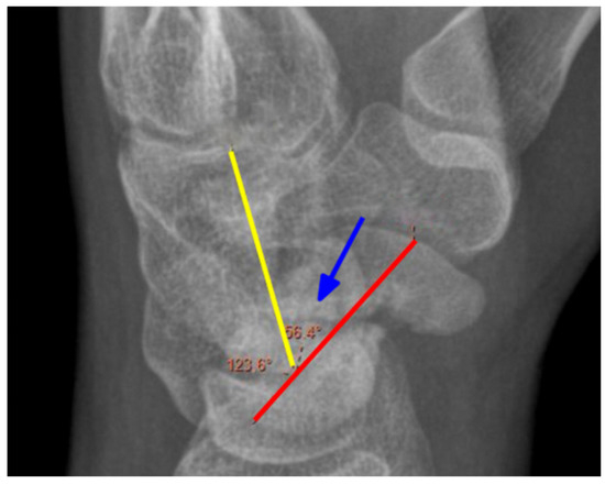 Measurement of the CLA angle. Blue arrow—angle, yellow line—the axis of the capitate, red line—the axis of the lunate. X-ray of the right hand, PA view.