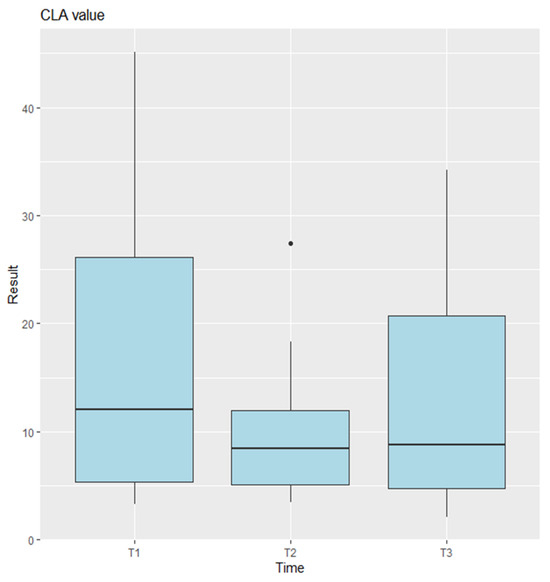 Anova results for CLA. T1 represents the preoperative measurements, T2 the postoperative measurements, and T3 the final follow-up. Points plotted outside the whiskers are considered outliers and represent data values that fall significantly below or above the typical range.
