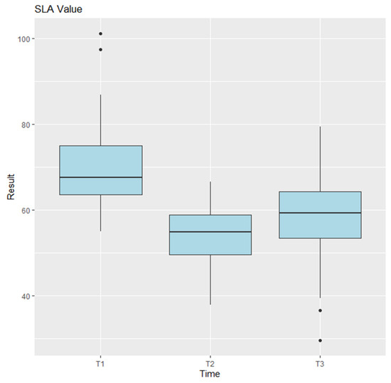 Anova results for SLA. T1 represents the preoperative measurements, T2 the postoperative measurements, and T3 the final follow-up. Points plotted outside the whiskers are considered outliers and represent data values that fall significantly below or above the typical range.
