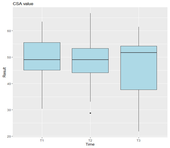 Anova results for CSA. T1 represents the preoperative measurements, T2 the postoperative measurements, and T3 the final follow-up. Points plotted outside the whiskers are considered outliers and represent data values that fall significantly below or above the typical range.