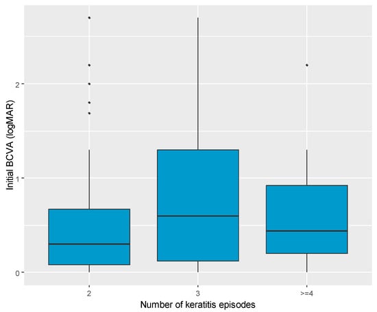 Among patients with recurrent keratitis, BCVA (logMAR) significantly differed based on the number of recurrences (p = 0.049) (Figure 2). Median BCVA was highest in patients with three episodes (logMAR 0.60), lower in those with four or more episodes (logMAR 0.44), and lowest in those with two episodes (logMAR 0.30), (Table 4).