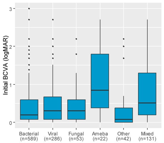Boxplot charts illustrating the distribution of median initial BCVA (logMAR) values across patient groups, stratified by keratitis type and severity.