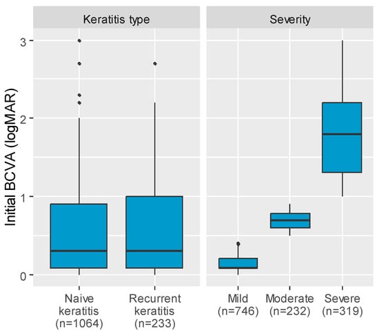 The median BCVA also differed significantly depending on the etiology of the infection (p < 0.001). The median BCVA was the lowest among patients with Acanthamoeba (logMAR 0.85), followed by those with mixed etiology (logMAR = 0.51), viral and fungal infection (logMAR 0.30 both groups), or bacterial infection (logMAR 0.20) (Figure 3). Post hoc analysis revealed that the median BCVA in patients with Acanthamoeba infection was significantly worse compared to other infection types, except mixed infections. Significant differences were also observed between viral and bacterial infections, viral and other infections, and between mixed and bacterial infections (Table 3). The median of the initial BCVA was comparable between the recurrent and naïve infection groups (Figure 4). Most patients presented with mild keratitis (n = 746), followed by severe cases (n = 319), and lastly, moderate keratitis (n = 232) (Figure 4).