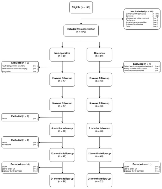 This study describes the minimum 2-year follow-up on an already published prospective, single-center, assessor-blinded, randomized, controlled superiority trial comparing non-operative versus operative treatments of unstable DRFs in patients ≥ 65 years [14]. A study protocol was also published [18]. The primary study took place between November 2019 and March 2022.