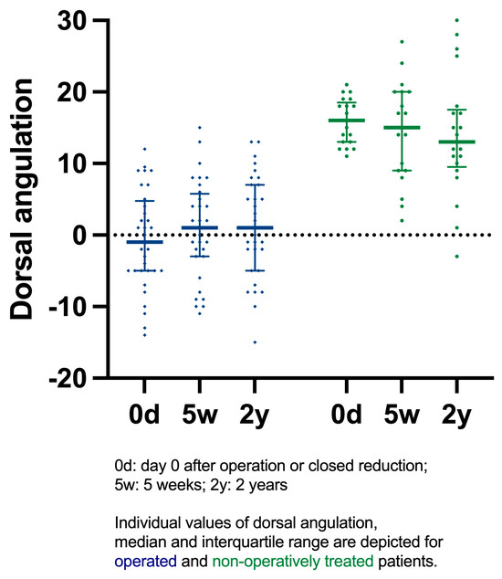 The dorsal angulation was statistically significantly different between the treatment groups (p < 0.001), while time did not have a statistically significant impact when comparing immediate post-operative or closed reduction radiographs to radiographs after 5 weeks and 2 years (p = 0.978) (Figure 2). Notably, the AO/OTA classification was comparable with the AO type A/B/C distributed as follows: (19/4/9) in the operative group and (11/5/12) in the non-operative group.
